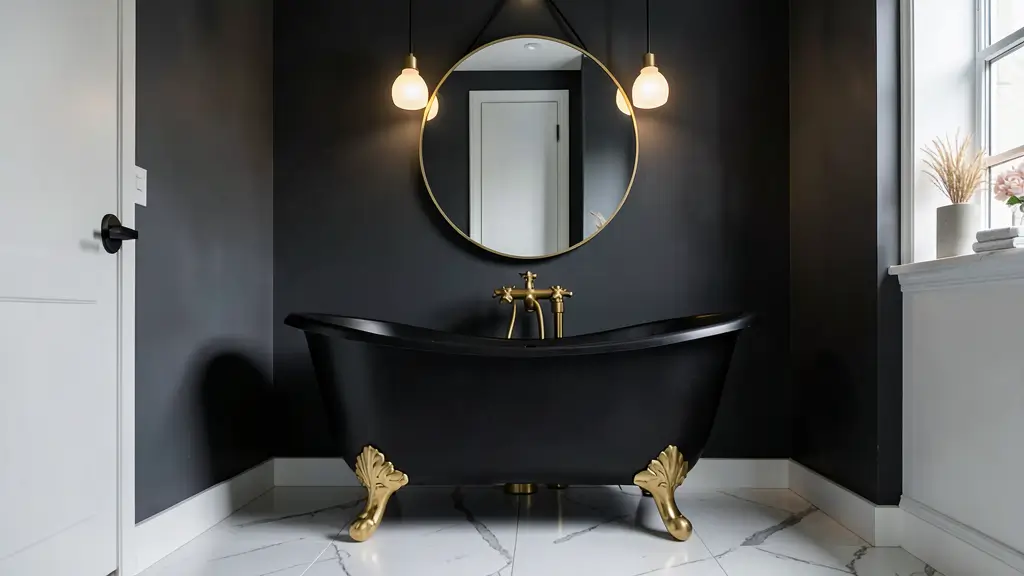 I’ve seen black tubs work beautifully against white subway tiles with black grout, creating this high-contrast look that’s simultaneously classic and edgy. Or go full moody with dark walls, brass fixtures, and marble accents for a look that’s basically bathroom goals.