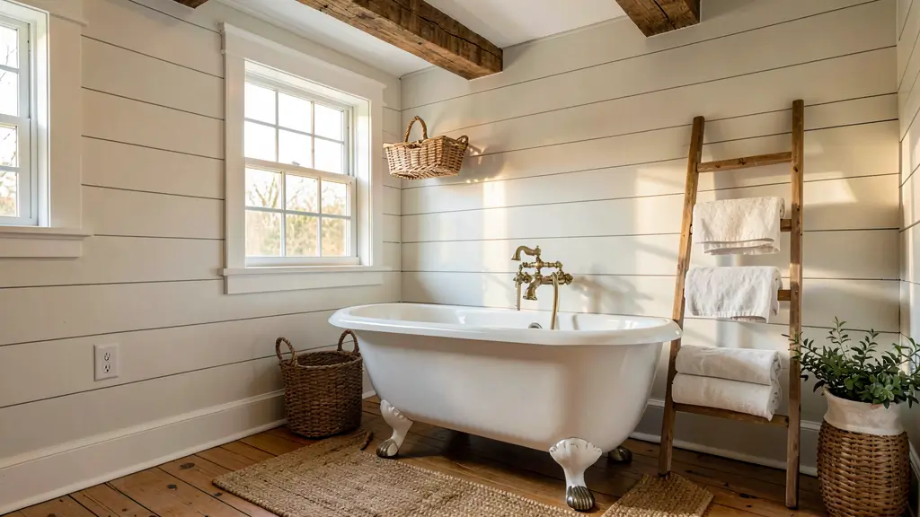 The farmhouse bathroom celebrates imperfection and authenticity. Your clawfoot tub doesn’t need to be pristine—a little wear actually adds character. Pair it with reclaimed wood shelving, galvanized metal accents, and plenty of soft, neutral textiles. Think linen curtains, woven baskets, and maybe a vintage rug that’s seen better days (in the best way possible).