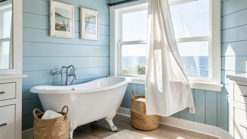 The coastal bathroom celebrates light, air, and ocean-inspired colors. We’re talking soft blues, sandy beiges, crispy whites, and maybe some seafoam green accents. Your clawfoot tub (ideally in white or a soft blue-gray) becomes the centerpiece of this beachy retreat.