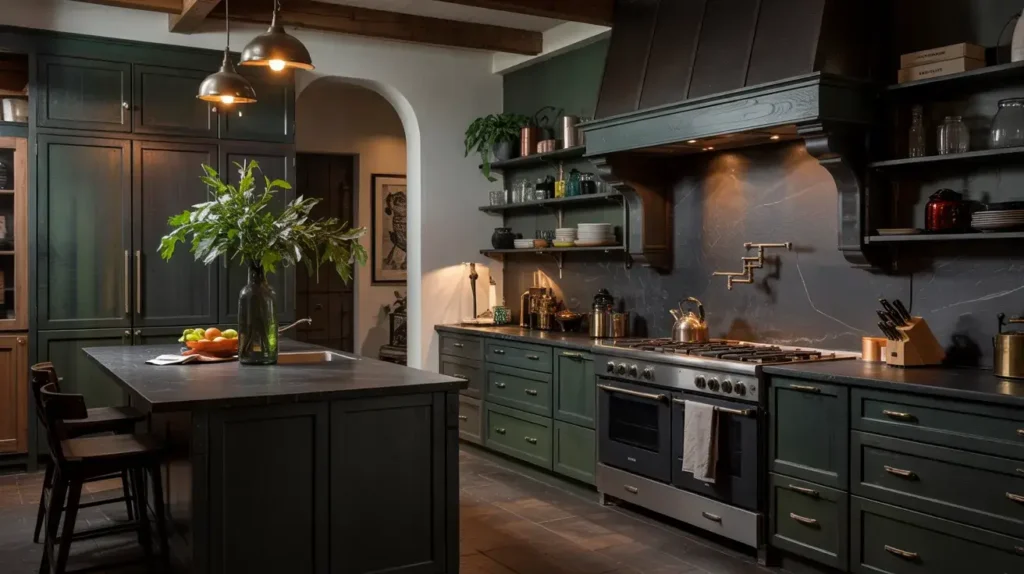 Most people instinctively try to “brighten up” a dark color. But what if you leaned into the darkness? Pairing dark green cabinets with black accents creates an ultra-moody, industrial, and edgy aesthetic. This is not a look for the faint of heart, but the payoff is massive.