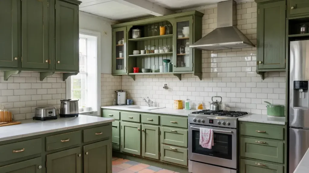 • Tone-on-Tone: If you are feeling daring, use a green tile that matches your paint. A glossy green herringbone tile against matte green cabinets creates a monochromatic, textured look that is incredibly high-fashion.