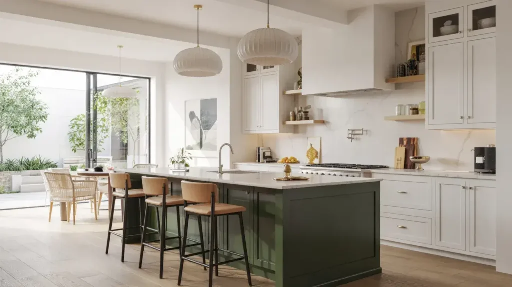 Commitment is hard. I get it. Painting your entire kitchen dark green feels like a massive leap of faith. If you are hesitating, why not start with just the island? The statement island allows you to keep your perimeter cabinets a safe, airy white or cream while injecting a massive dose of personality into the center of the room.
