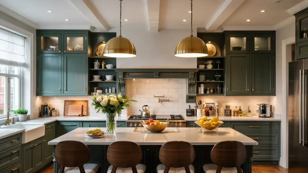 Pro Tip: Put every single light in your kitchen on a dimmer switch. Being able to dim those gold pendants low against the dark green cabinets turns your kitchen from a workspace into a party space instantly.