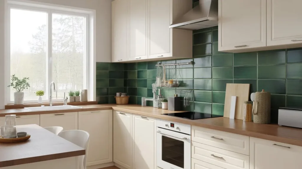 Pair a glossy emerald tile with under-cabinet lighting. The reflection creates a moody, atmospheric glow that makes late-night snacking feel like a fine dining experience.