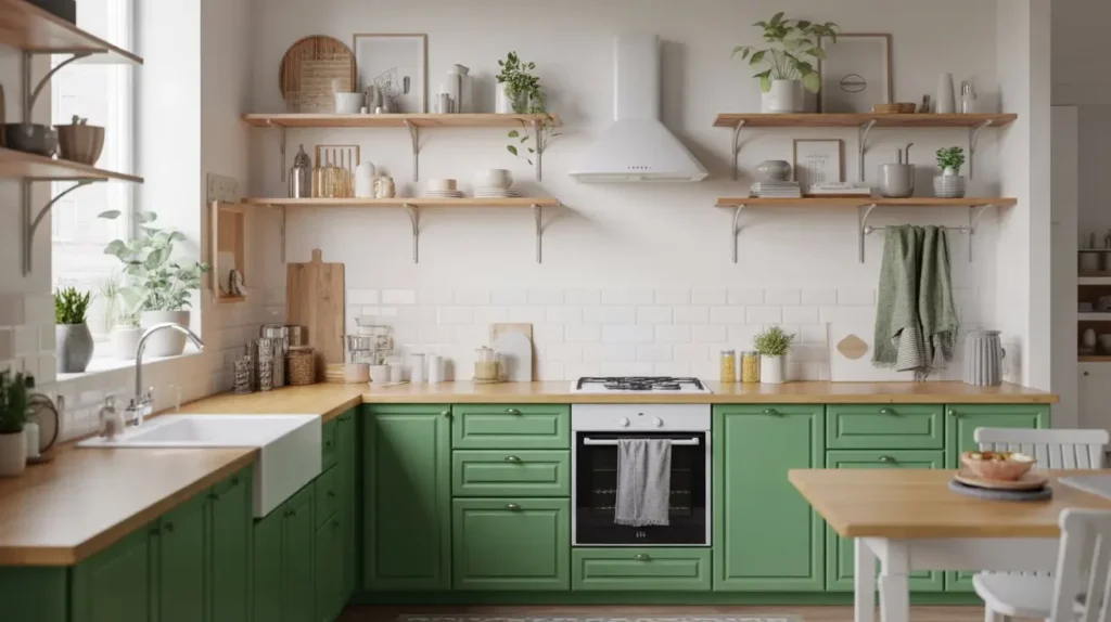 • Glass-front cabinets: Paint the insides green or leave them wood for contrast.