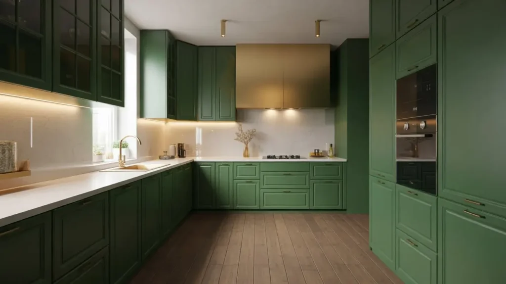 Forest green absorbs light like a black hole. You need to compensate. Install oversized pendant lights above the island. I prefer glass shades here to keep the visual space open. If you skimp on lighting, your moody kitchen will just look like a cave. And nobody cooks well in a cave.