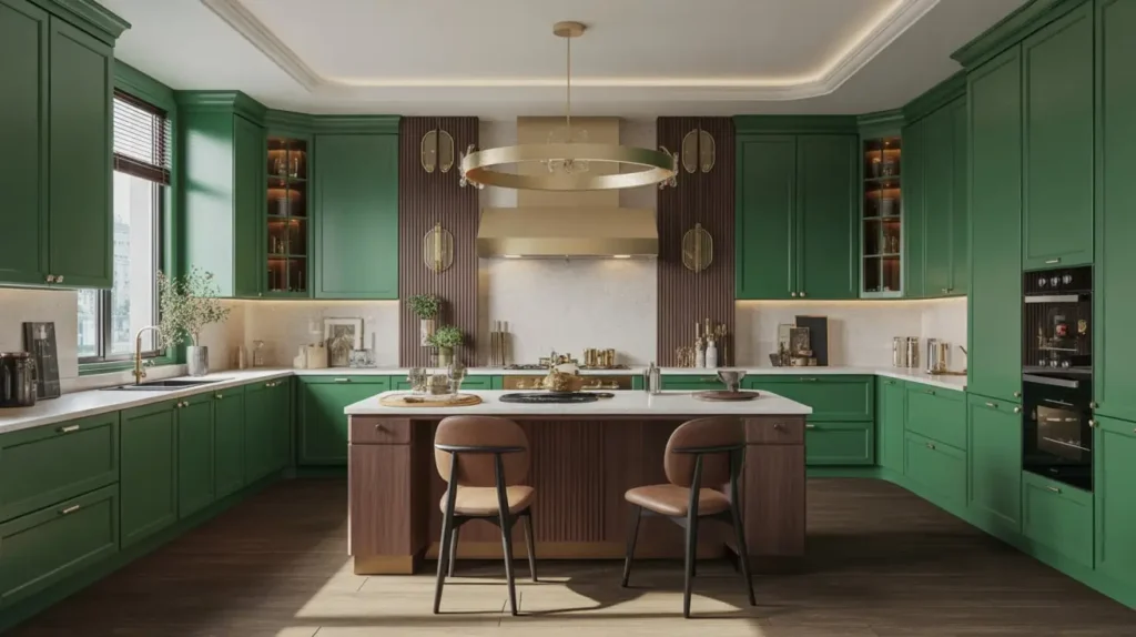 This is for the bold. Emerald green is a jewel tone that demands respect. When you pair it with chocolate brown accents, you get a kitchen that feels like an old-world speakeasy or a library in a mansion.