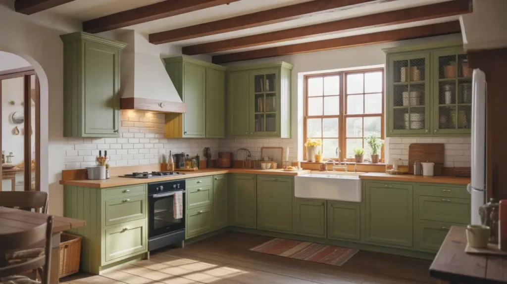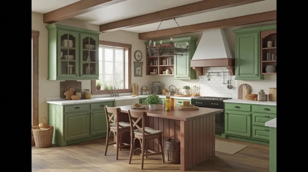 If you have high ceilings, you need to look up. Installing rustic brown wooden beams across a white ceiling changes the entire architecture of the room. Pair that with classic green shaker cabinets, and you have a timeless masterpiece.