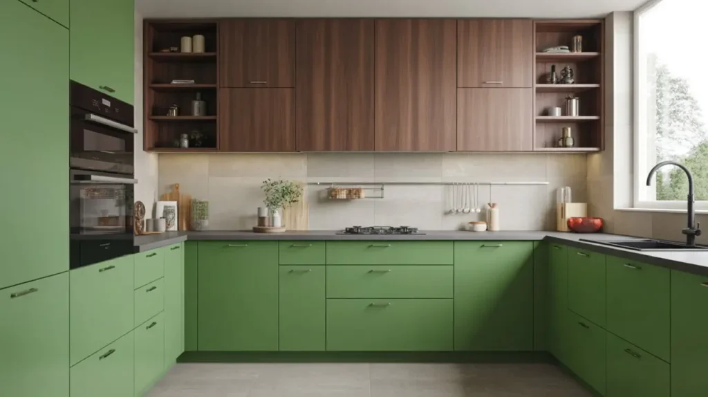 Modern design often gets a bad rap for being cold. But if you mix slab-front cabinets in green and brown, you get sleek lines with a warm soul. This is my absolute favorite look for contemporary homes because it feels clean but not sterile.