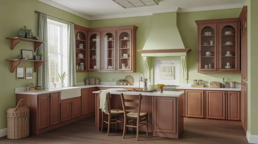 4. Soft Green Walls with Rich Brown Wood Cabinets