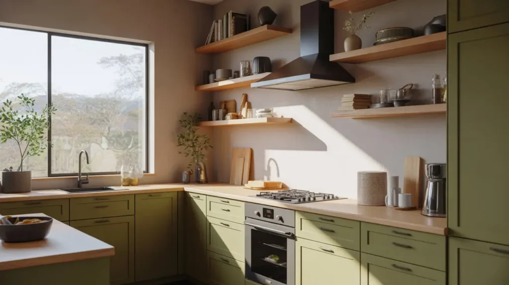 Ever wondered why this feels so high-end? It’s because it prioritizes texture over shine. The natural grain of the wood shelves breaks up the solid block of color from the cabinets, keeping the room from feeling heavy.