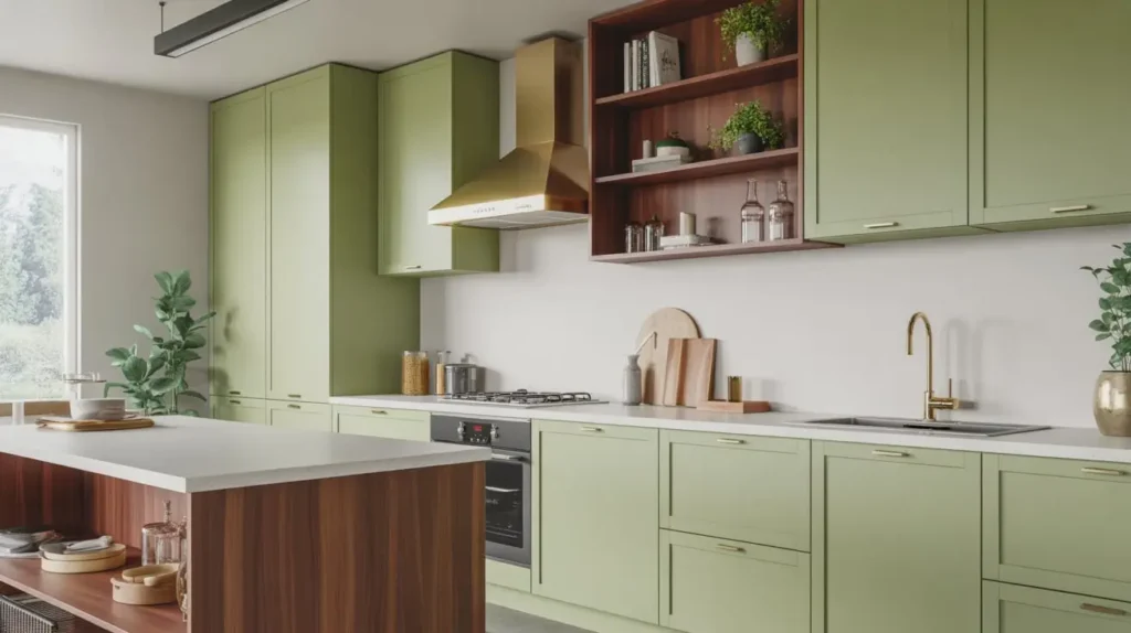 • Balance is Key: Use sage for the perimeter cabinets and walnut for open shelving or the island. This keeps the room from feeling too heavy on the wood tones.