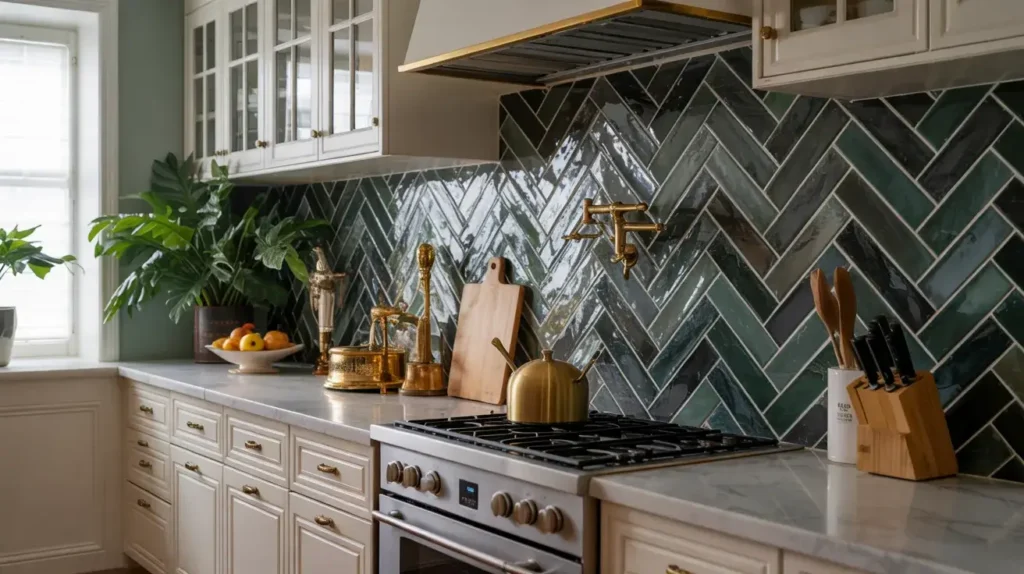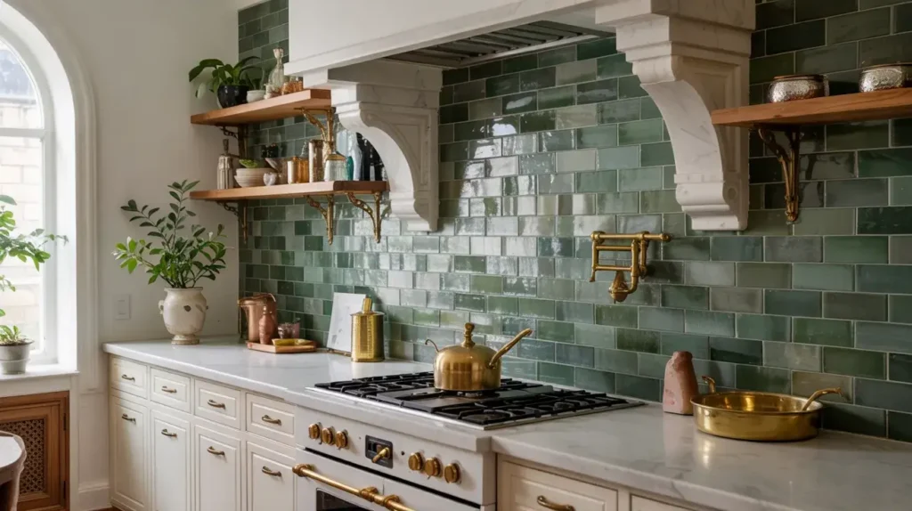 Now we are turning up the heat. Zellige tiles are handmade clay tiles from Morocco, and they are absolutely imperfect. And by imperfect, I mean they are uneven, chipped, wobble on the wall, and vary wildly in shade. That is exactly why I am obsessed with them. An Emerald Green Zellige backsplash reflects light in a way that flat, machine-made tiles just can’t.