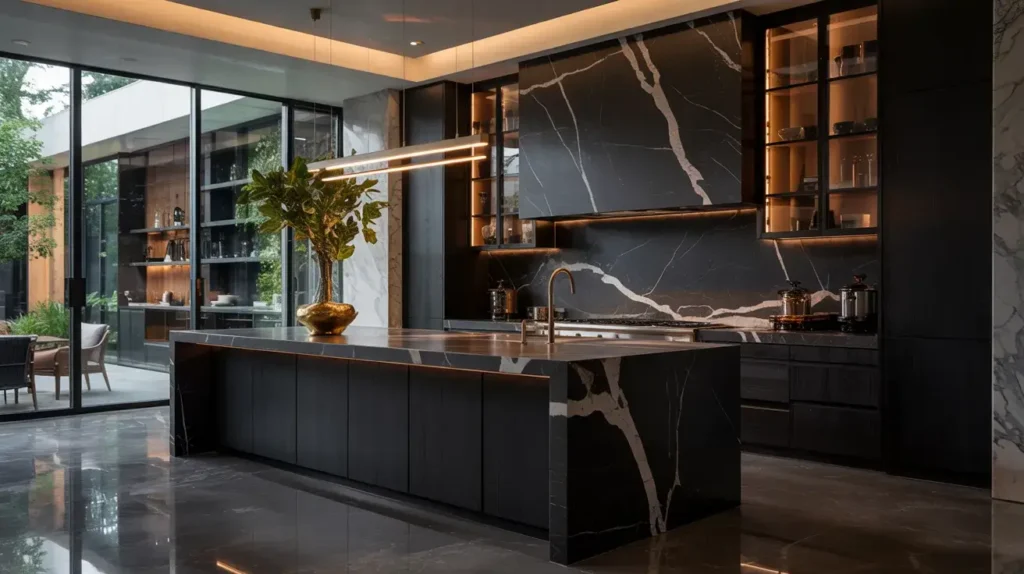 Combining black stone with wood elements results in a designer kitchen that feels organic. I admire how this mix balances raw and refined textures in perfect harmony. It’s like bringing a piece of nature indoors, but with sophistication and style. Have you thought about how stone and wood can coexist harmoniously in a design?