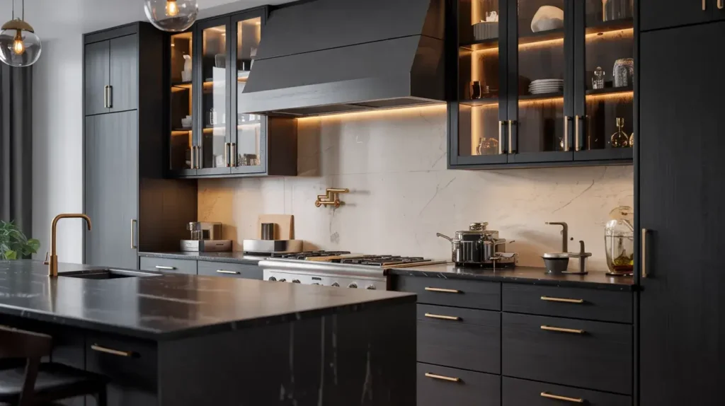 Incorporating black glass into your kitchen adds a sleek, modern accent that catches the eye. I’m fascinated by how glass can reflect and refract light in dark spaces. It’s a subtle way to introduce luxury without overwhelming the senses. Have you considered glass as a functional art piece in your kitchen design?