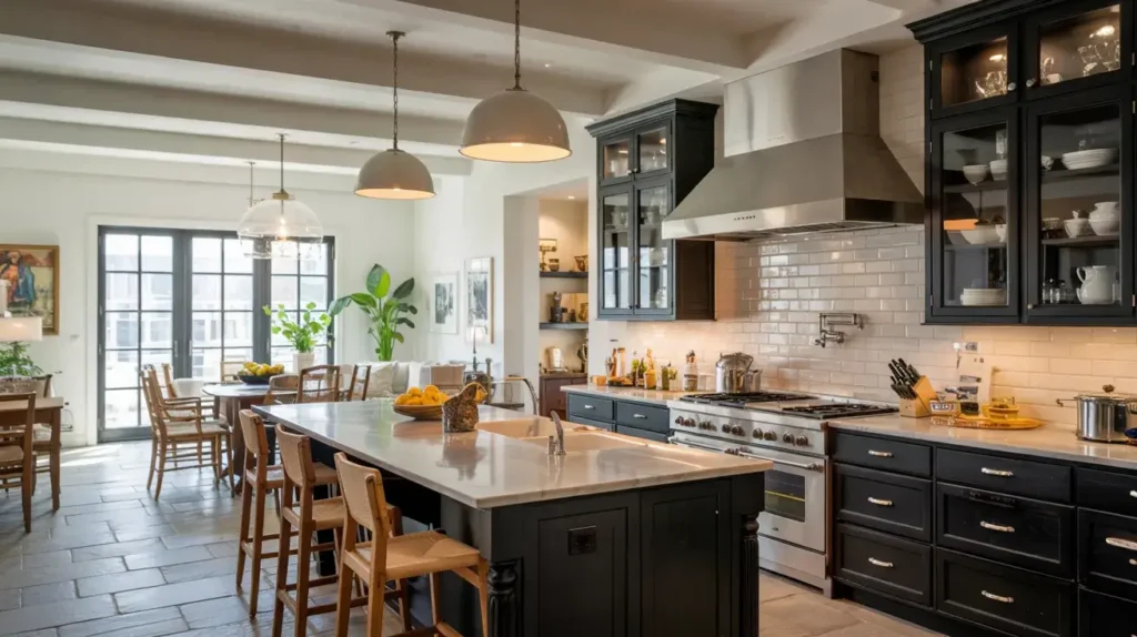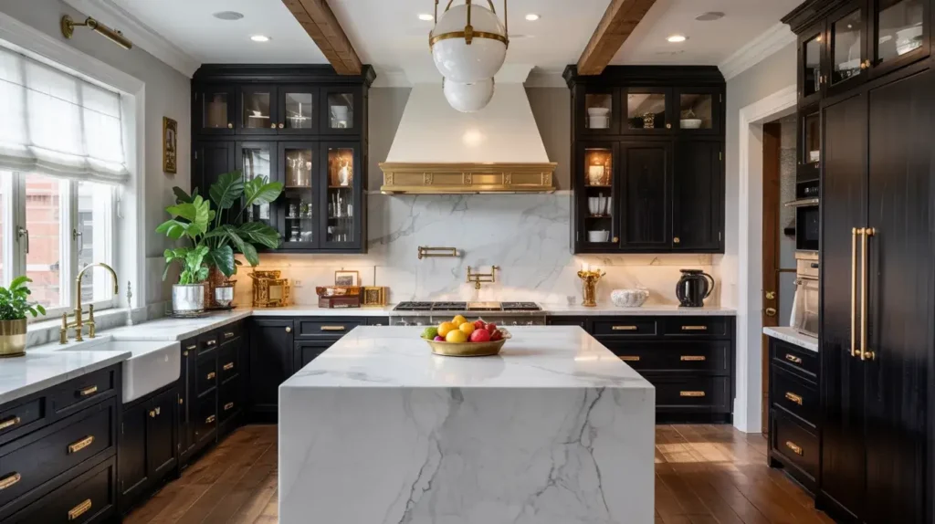 Black granite or soapstone countertops offer durability and depth for heavy use. Reclaimed wood beams or accents introduce warmth and history to the space. Black cabinetry unifies the palette and grounds the design with authority. This kitchen becomes a conversation starter for guests and a joy for the cook.