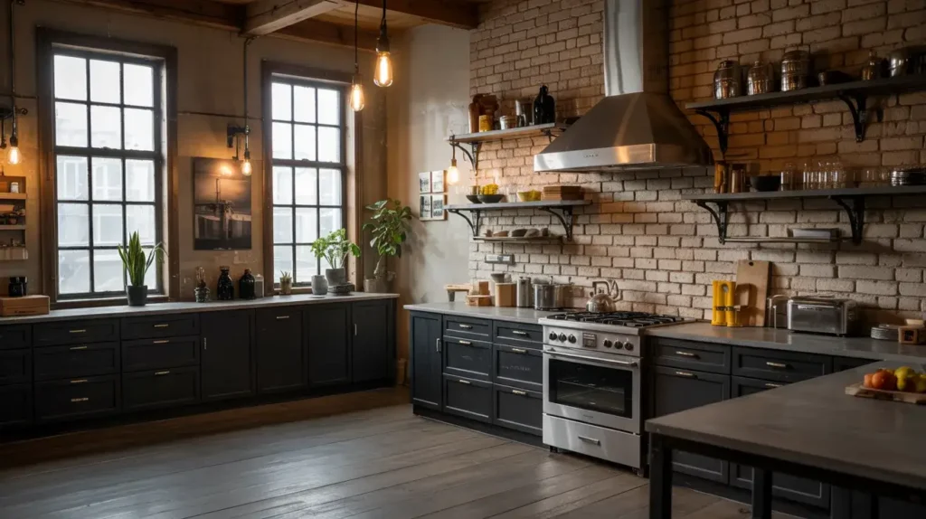 Black metal frames on cabinets or islands add structure and an urban edge. Concrete-look countertops provide a modern, industrial vibe that is very trendy. Warm wood tones soften the industrial vibe and make the space livable. This kitchen balances toughness with comfort in a way that few styles can.