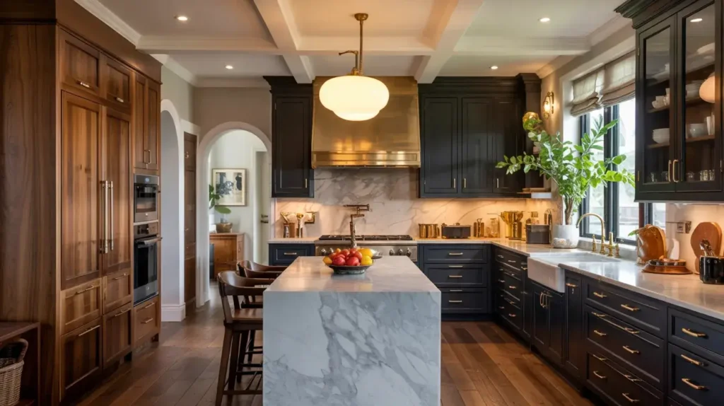 It’s a dance, but this pairing nails it with style and grace every time. Black lower cabinets ground the space and provide a solid visual foundation. Walnut upper cabinets or shelves add natural warmth and break up the darkness. Brass or nickel hardware complements both materials and ties the look together.