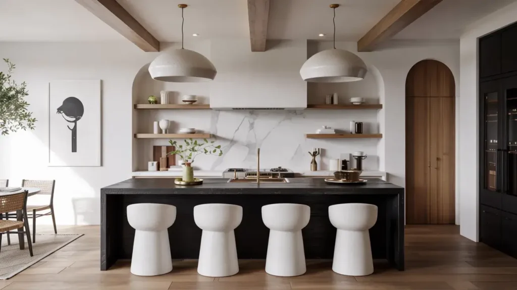 Waterfall edge black countertops create a seamless, dramatic look that is very modern. Contrasting bar stools in leather or wood add comfort and style to the seating. Integrated sinks or cooktops maintain clean lines and a streamlined appearance. This kitchen celebrates the island as a masterpiece and a hub for activity.