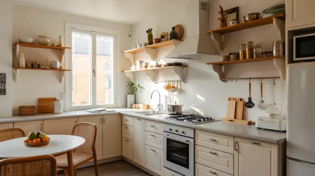 15. Small Kitchen Off-White Cabinets with Open Shelving