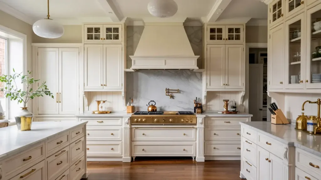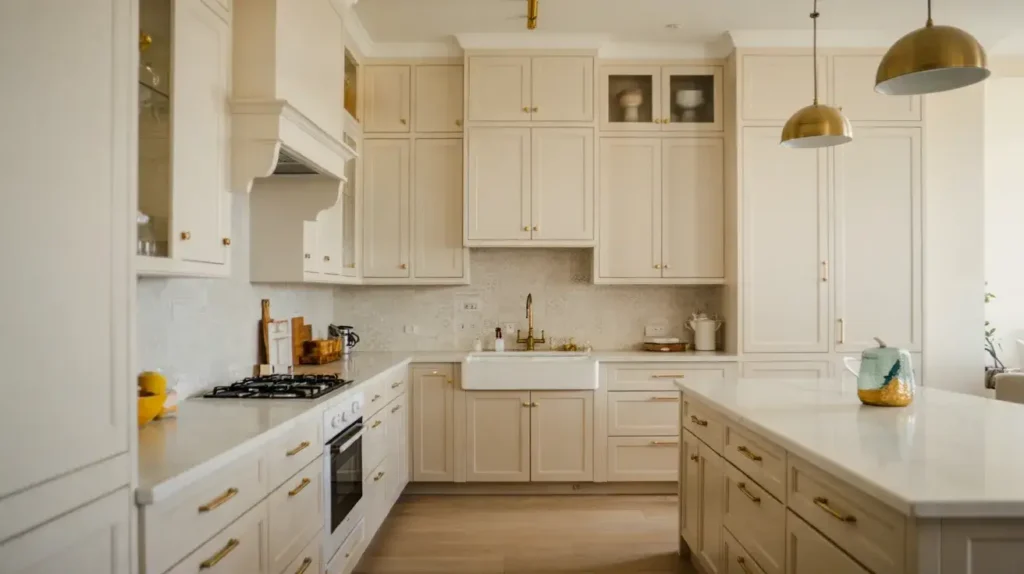 1. Warm Cream Off-White Cabinets with Gold Hardware