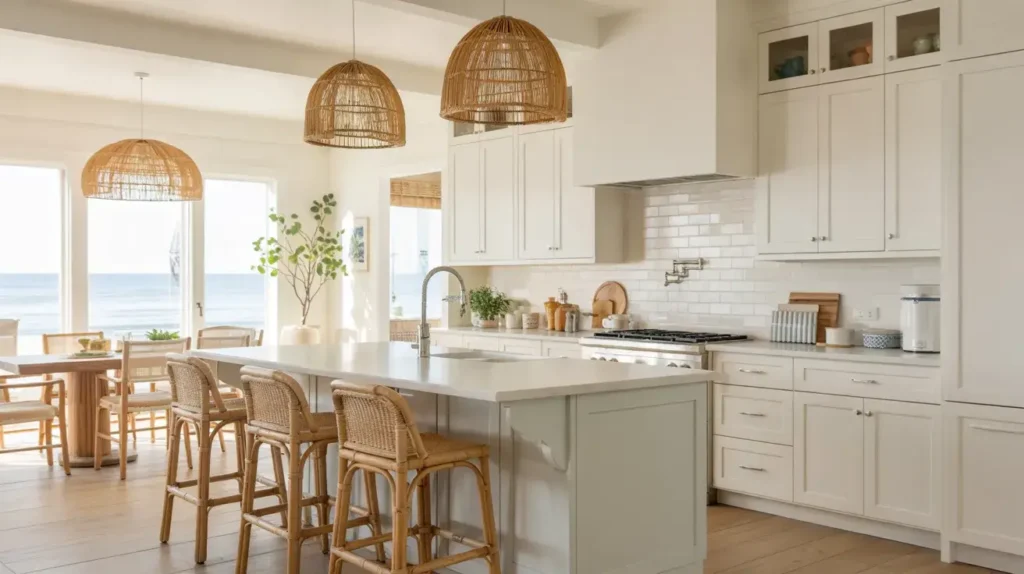 I’ve seen this done beautifully with natural wood elements, rope drawer pulls, and glass pendant lights that look like buoys. But please, I’m begging you, resist the urge to add “Beach Please” signs. Your kitchen is better than that.