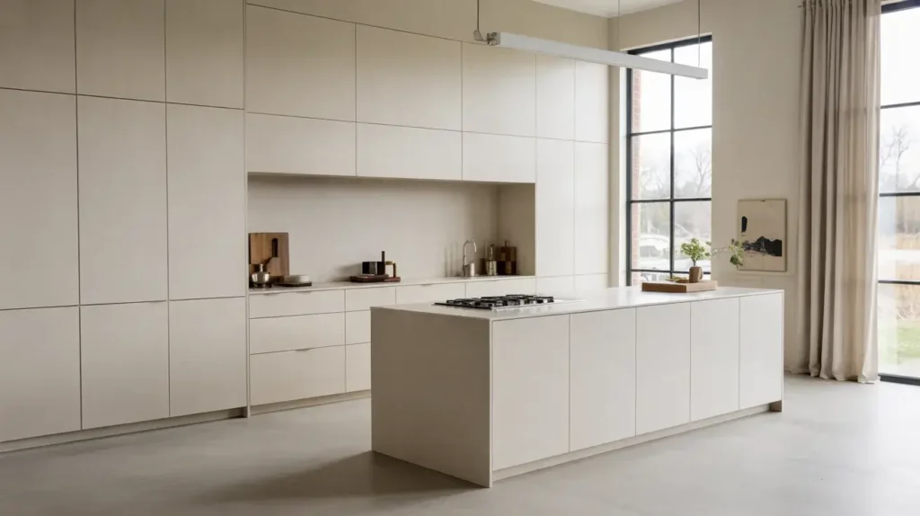 10. Minimalist Off-White Cabinets with Hidden Handles