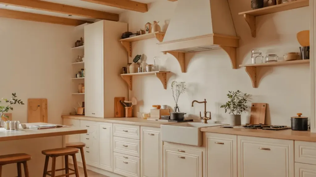 3. Soft Ivory Cabinets with Natural Wood Accents