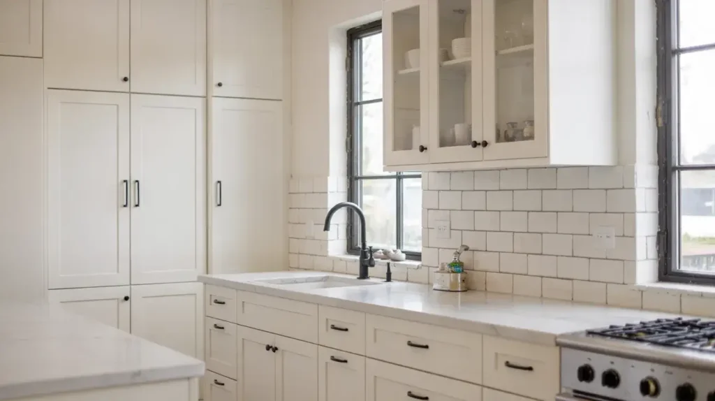 4. Off-White Shaker Cabinets with Matte Black Fixtures