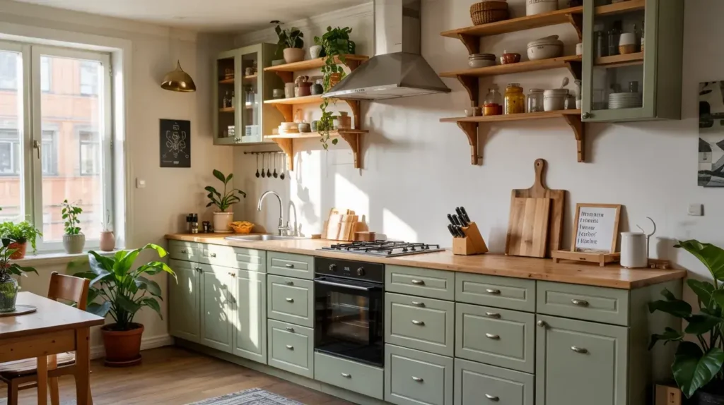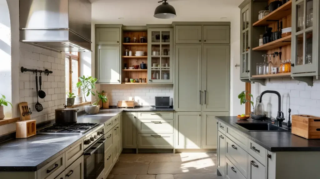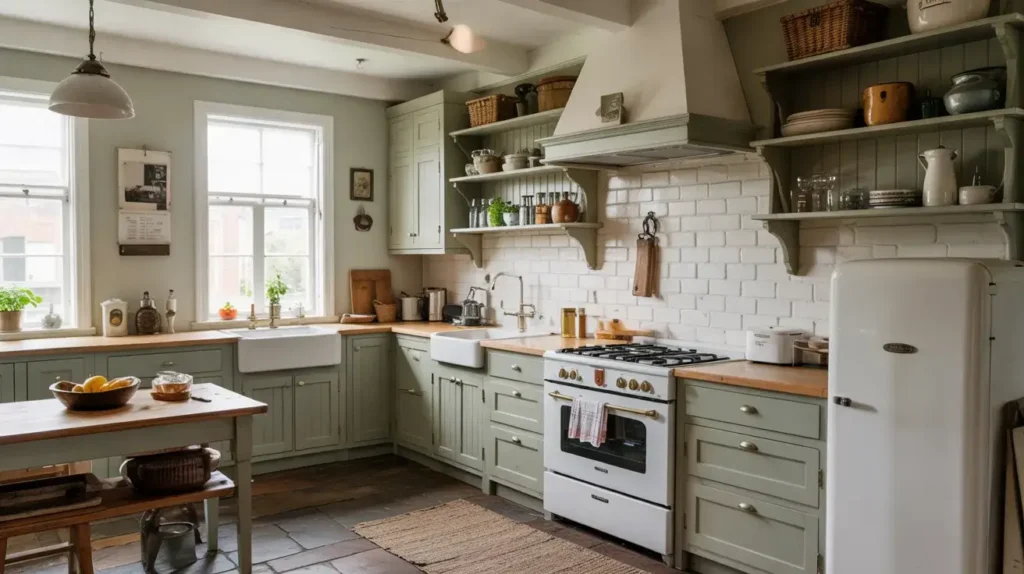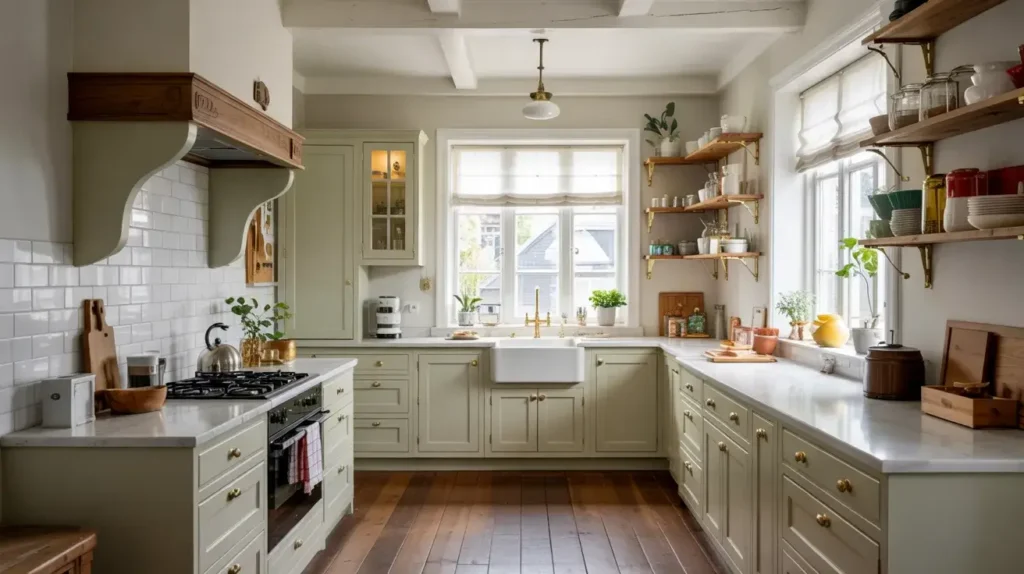 Cottage style is the cozy, slightly messier cousin of farmhouse style. It’s about nostalgia and comfort. A sage green cottage kitchen should feel like it belongs in a storybook.