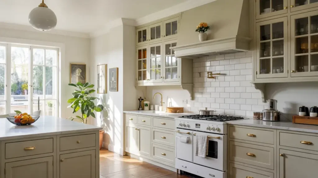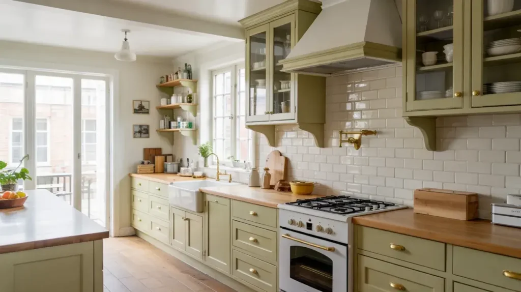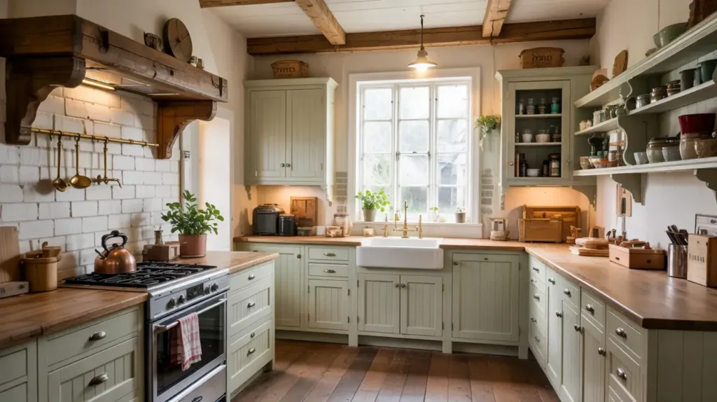I stayed in a cottage in the UK once that had this exact kitchen setup. The cabinets were a pale, muddy sage, the floors were uneven stone, and there was a constant pot of tea on the stove. It felt like a warm hug. That is the vibe we are chasing here.