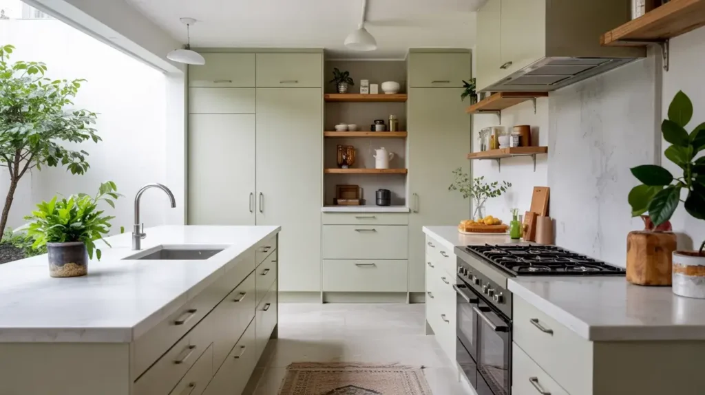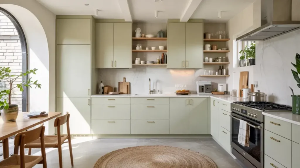 Let’s swing back to the modern side for a moment. If you hate dusting intricate cabinet doors and love clean lines, a flat-panel (slab) sage kitchen is your dream come true. This style strips away all the ornamentation, letting the color do the heavy lifting.
