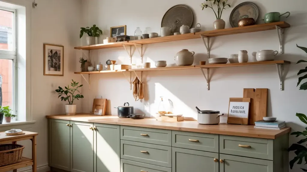 - The Palette: Stick to white, cream, wood, and glass items on the shelves. The sage wall behind them acts as a backdrop.