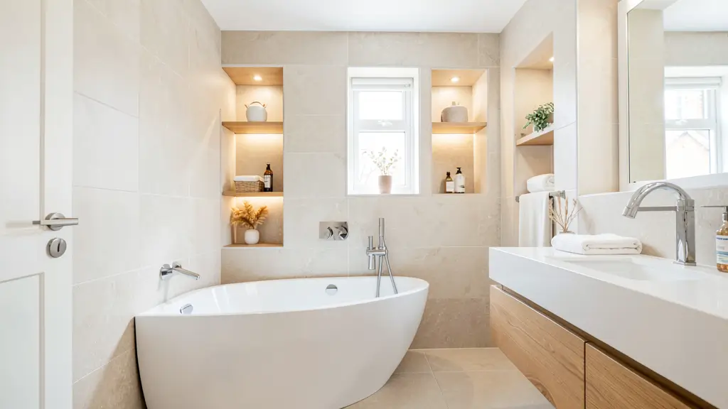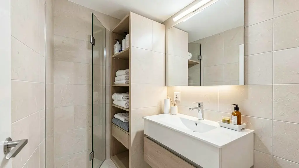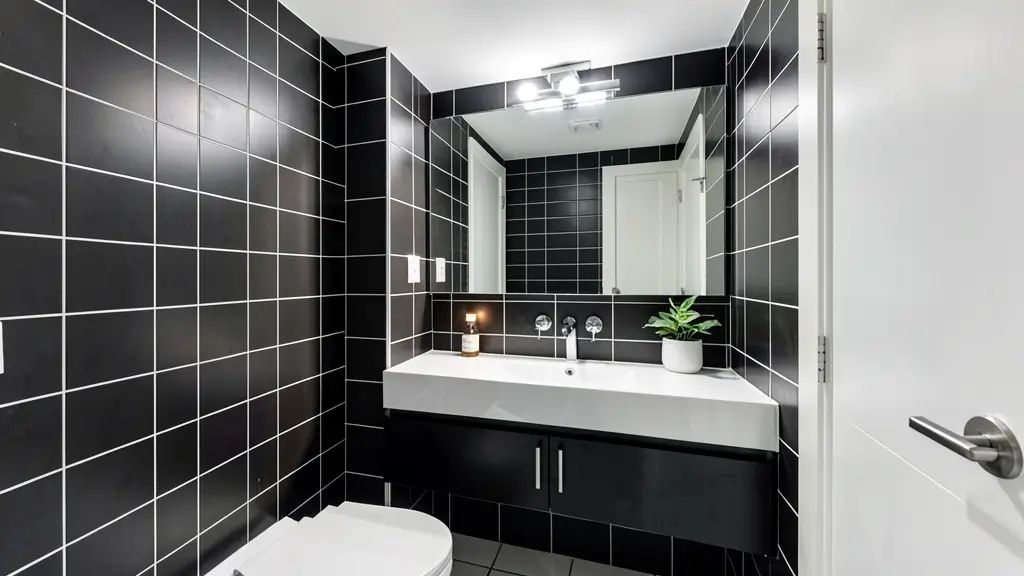 - Mix textures: Matte tiles, glossy fixtures, natural wood accents