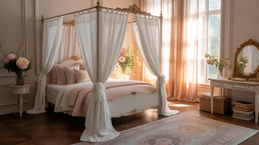 Let’s start with the showstopper—the canopy bed. If there’s one piece that screams “vintage princess,” it’s a gorgeous canopy bed draped with flowing fabrics that make you feel like Sleeping Beauty minus the whole cursed spindle situation.