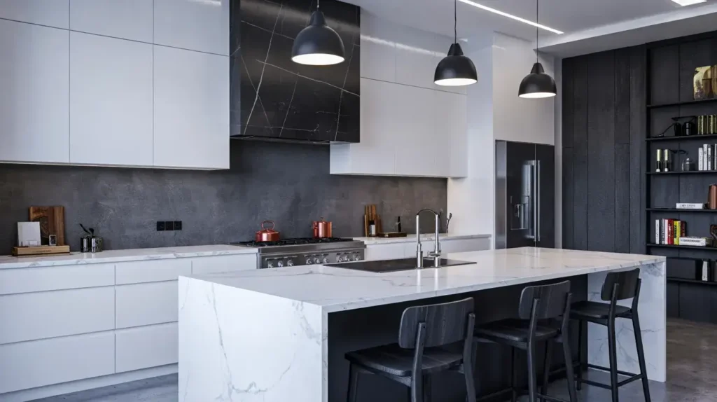 If you want drama, this is it. White quartz countertops paired with matte black cabinets create the ultimate contemporary contrast that never gets old. This combo is like the little black dress of kitchen design—classic, sophisticated, and always in style.