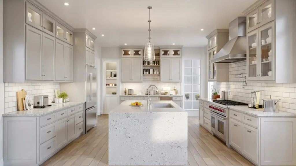 Looking for something that’s elegant but not too flashy? White granite countertops with gray cabinets deliver that sophisticated, understated look that works in virtually any home style. This combination is incredibly popular right now, and for good reason.
