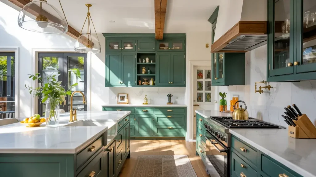 Emerald green is rich, luxurious, and surprisingly versatile. When you pair it with crisp white countertops, the green really pops without overwhelming the space. The white provides visual relief and brightness, keeping the overall feel balanced rather than dark or heavy.