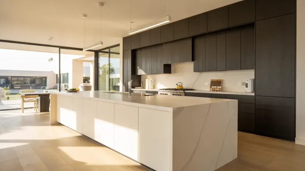 I’ve noticed this design works best when you use large-format slabs with minimal seams. Materials like quartz or porcelain are perfect because they come in huge sizes and maintain that seamless appearance. Add some recessed lighting under the cabinets and maybe a single statement pendant over the island, and you’ve got yourself a showstopper.