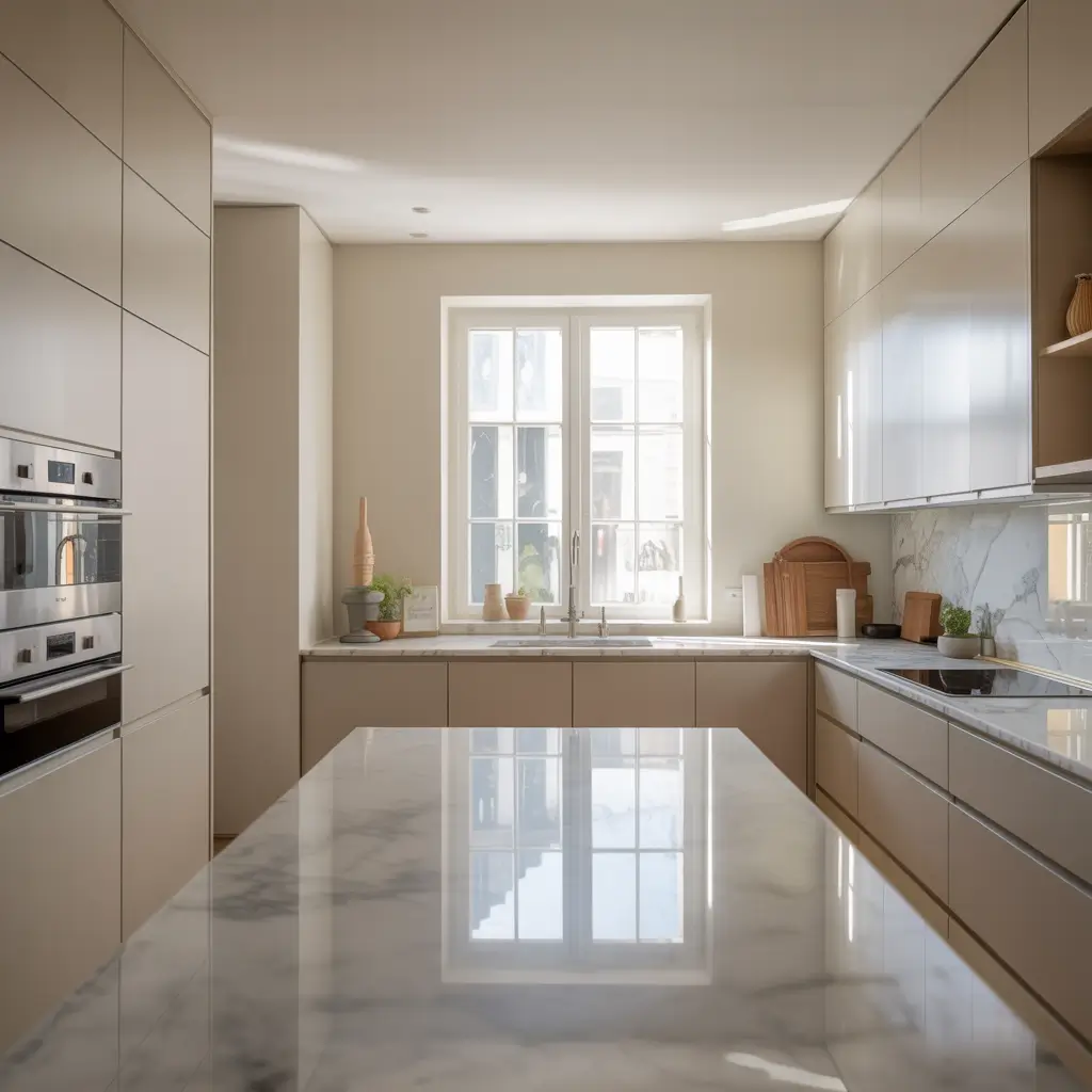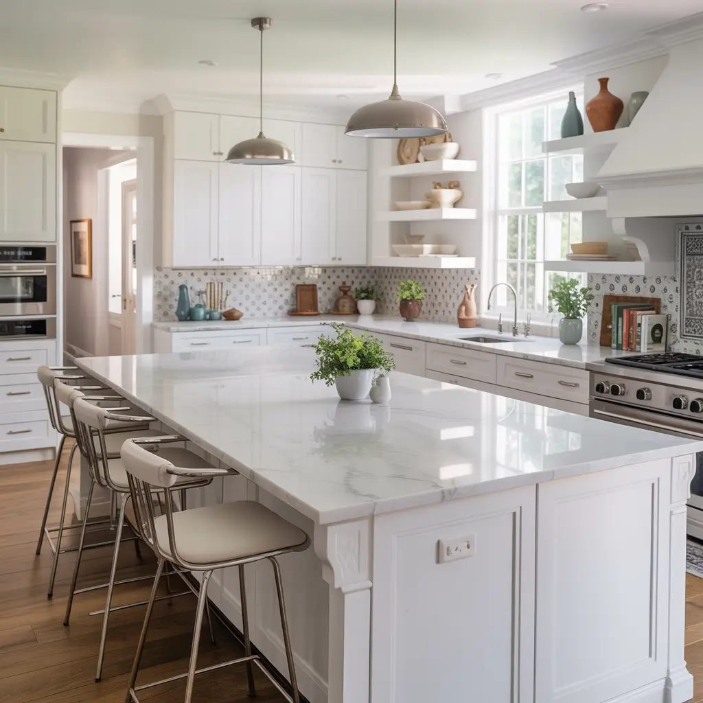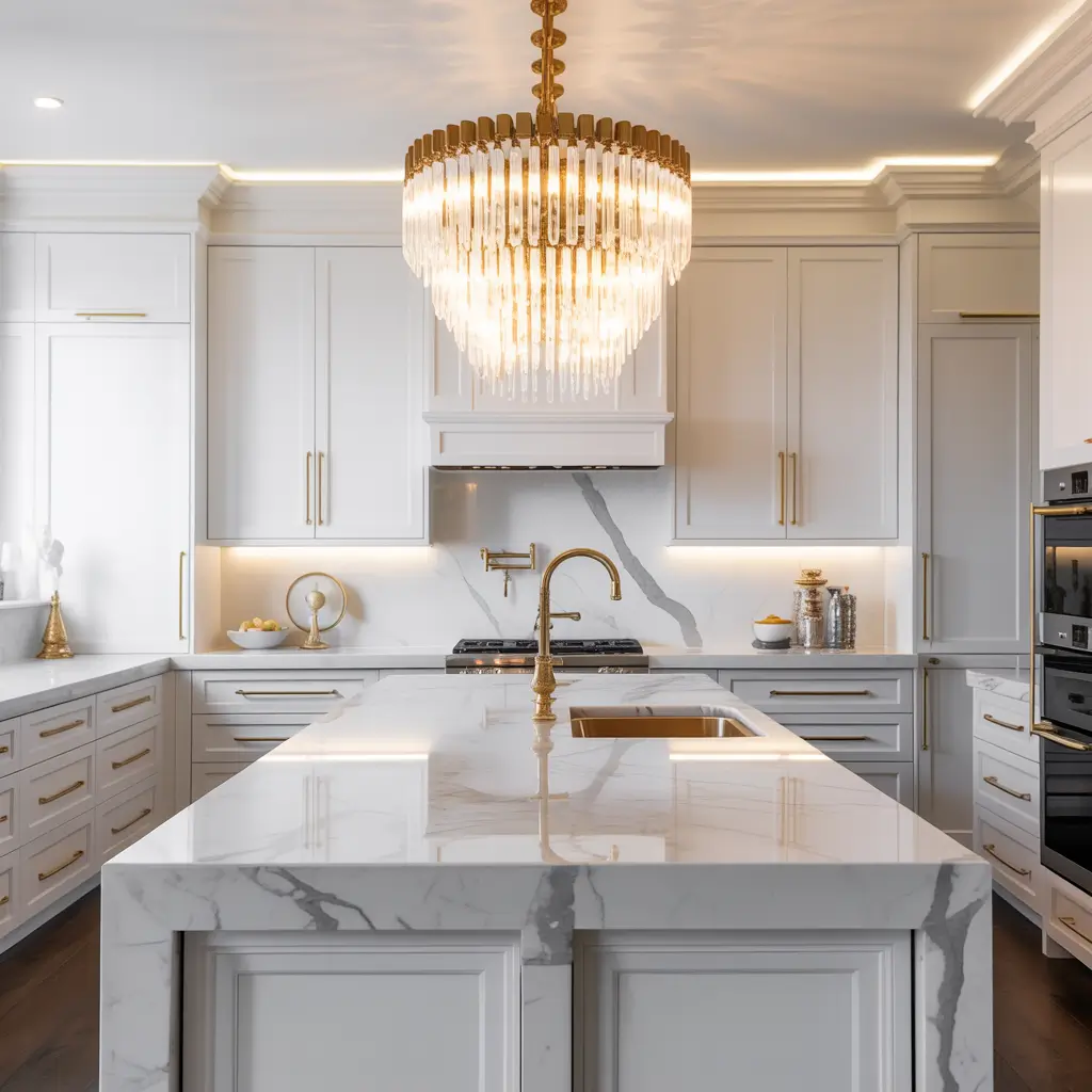- Marble or quartz counters with subtle veining