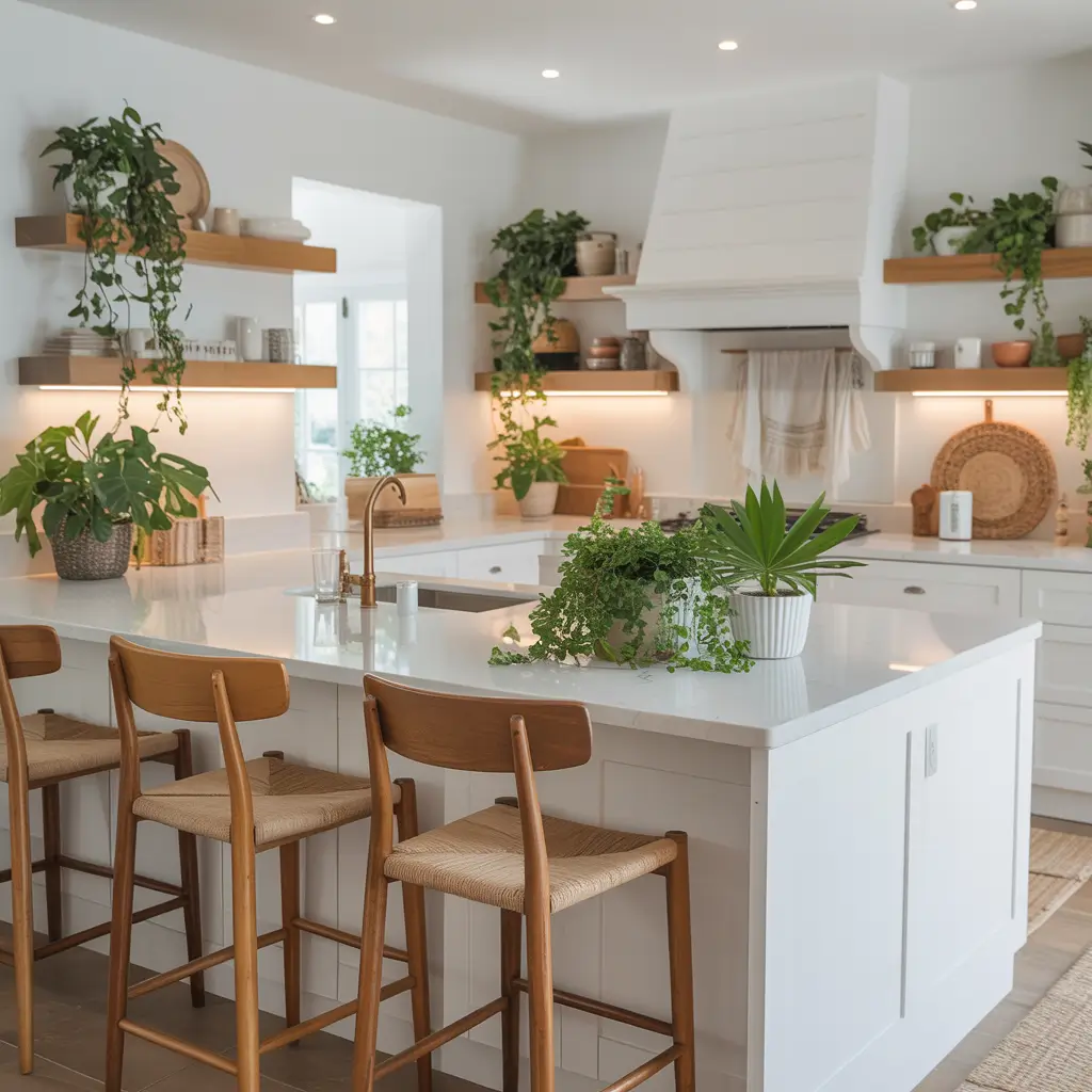A Scandi white kitchen combines clean lines with organic materials and plenty of light. These kitchens feel calm and uncluttered without being sterile. They incorporate natural wood, plants, and textured textiles to add warmth to the predominantly white palette.