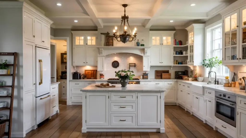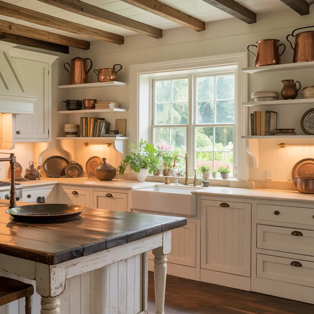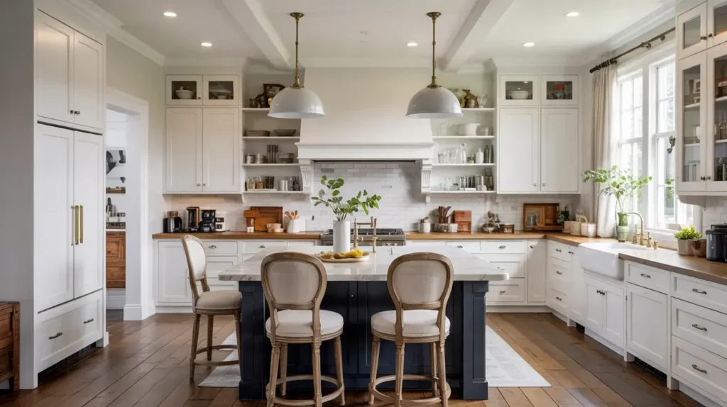 A white farmhouse kitchen is all about mixing old and new, rough and refined, functional and decorative. You’re pulling inspiration from actual working farm kitchens but updating them for modern life. Think deep apron-front sinks, open shelving with vintage dishes, and lots of natural materials.