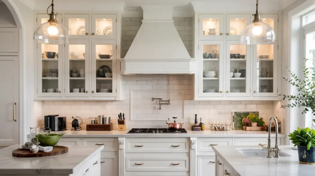 The secret is being strategic about where you use glass doors and what you put behind them. You don’t need to swap every cabinet door for glass—that’s overkill. Instead, choose a few upper cabinets (flanking a window, on either side of the range, or above a sink) to highlight.