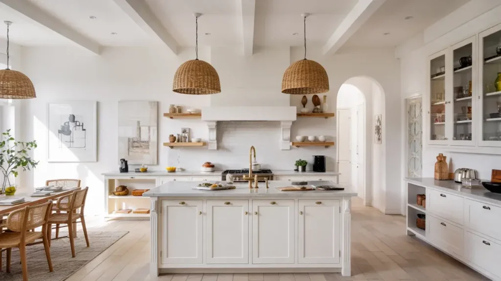 A coastal white kitchen combines crisp white with soft blues, natural textures, and materials that reference the ocean. Think weathered wood, sea glass colors, rope details, and lots of natural light. The overall effect is casual, comfortable, and effortlessly elegant.