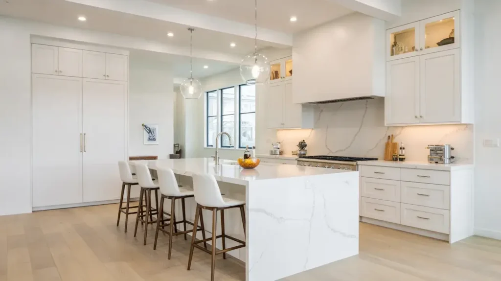 - Light countertops (white quartz or marble) to maintain brightness