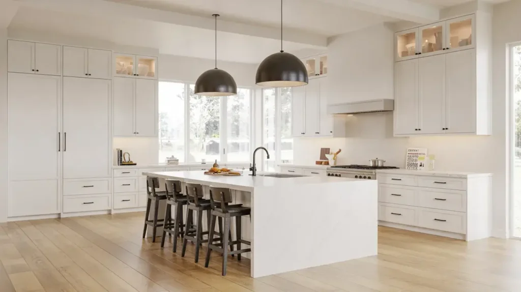 Here’s a secret: minimalism in kitchens is actually harder to achieve than it looks. Everything needs a purpose and a place, or the whole aesthetic falls apart. White shaker cabinets work beautifully here because their simple recessed panel design aligns perfectly with minimalist principles.